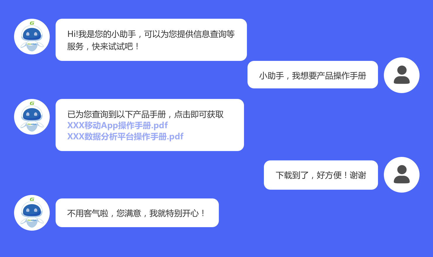 为保障良好的用户体验,平台会自动识别需要人工服务的重要会话,并在平台的人工客服界面进行实时提醒,客服可随时介入用户和机器人的对话,辅助解决复杂的操作性问题。平台识别而非用户主动转人工的方式,可以将有限的人力资源价值最大化,真正解决需要人工客服的会话。
