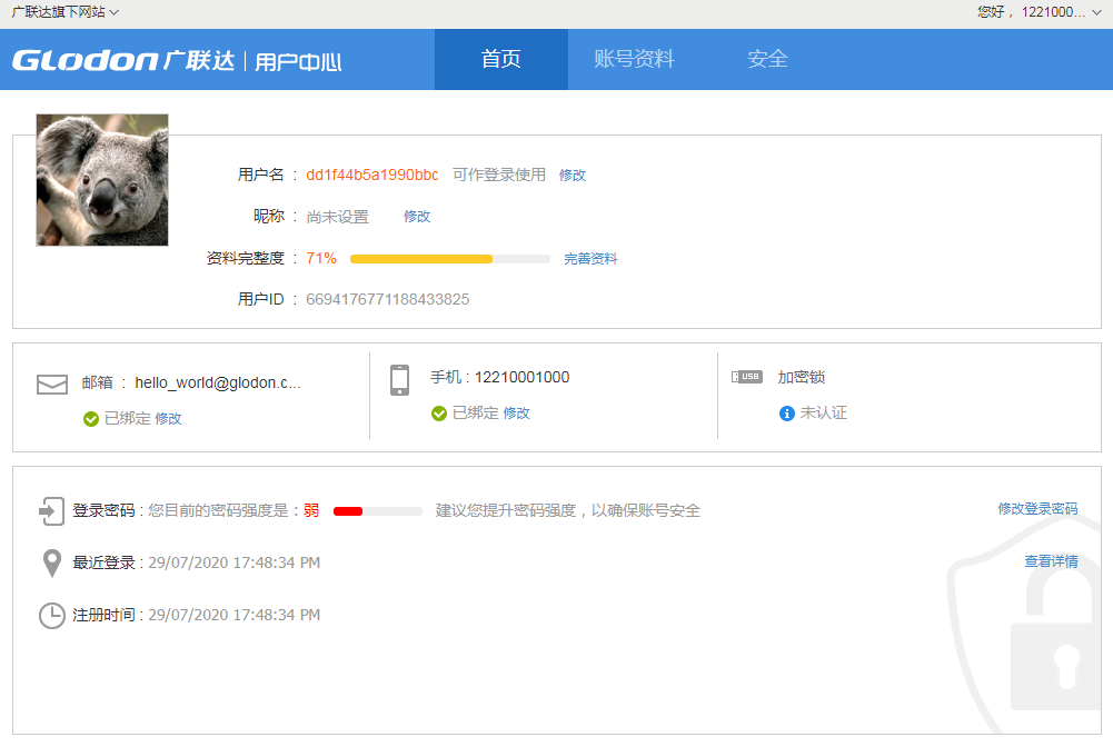 用户中心将同一用户在各种不同业务应用之间的账号打通,用户可以通过访问用户中心直接管理自己的账号信息,修改密码、绑定登录手机号/邮箱、关联社交账号、修改基本资料等。同时,各业务线也可以通过API调用快速实现用户信息的管理,一次修改,处处生效,减轻用户的账号负担。