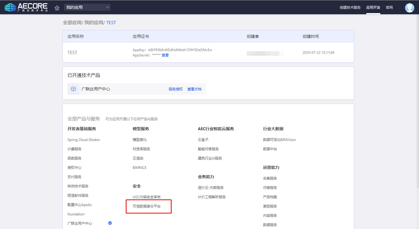 登录AECORE,并创建应用,创建应用后即可获取appkey、appsecret,这是调用服务的秘钥请妥善管理。