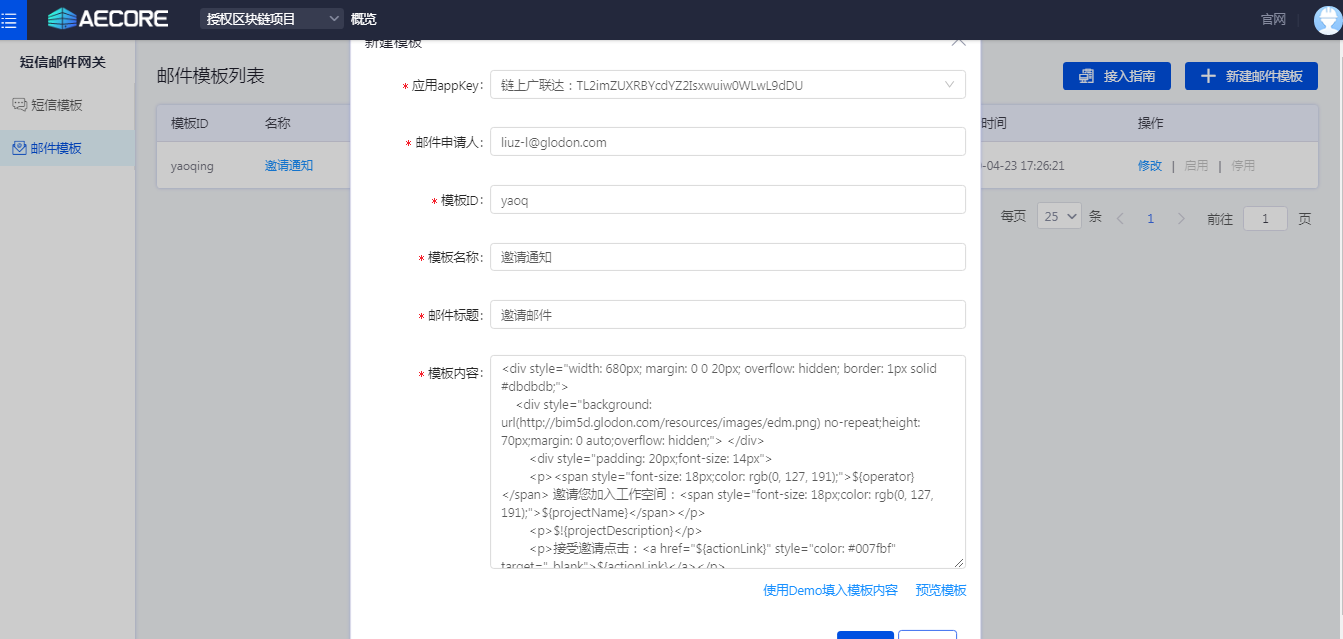 获取邮件、短信模板操作:1、登录AECORE;2、开通邮件短信服务;3、创建邮件、短信模板