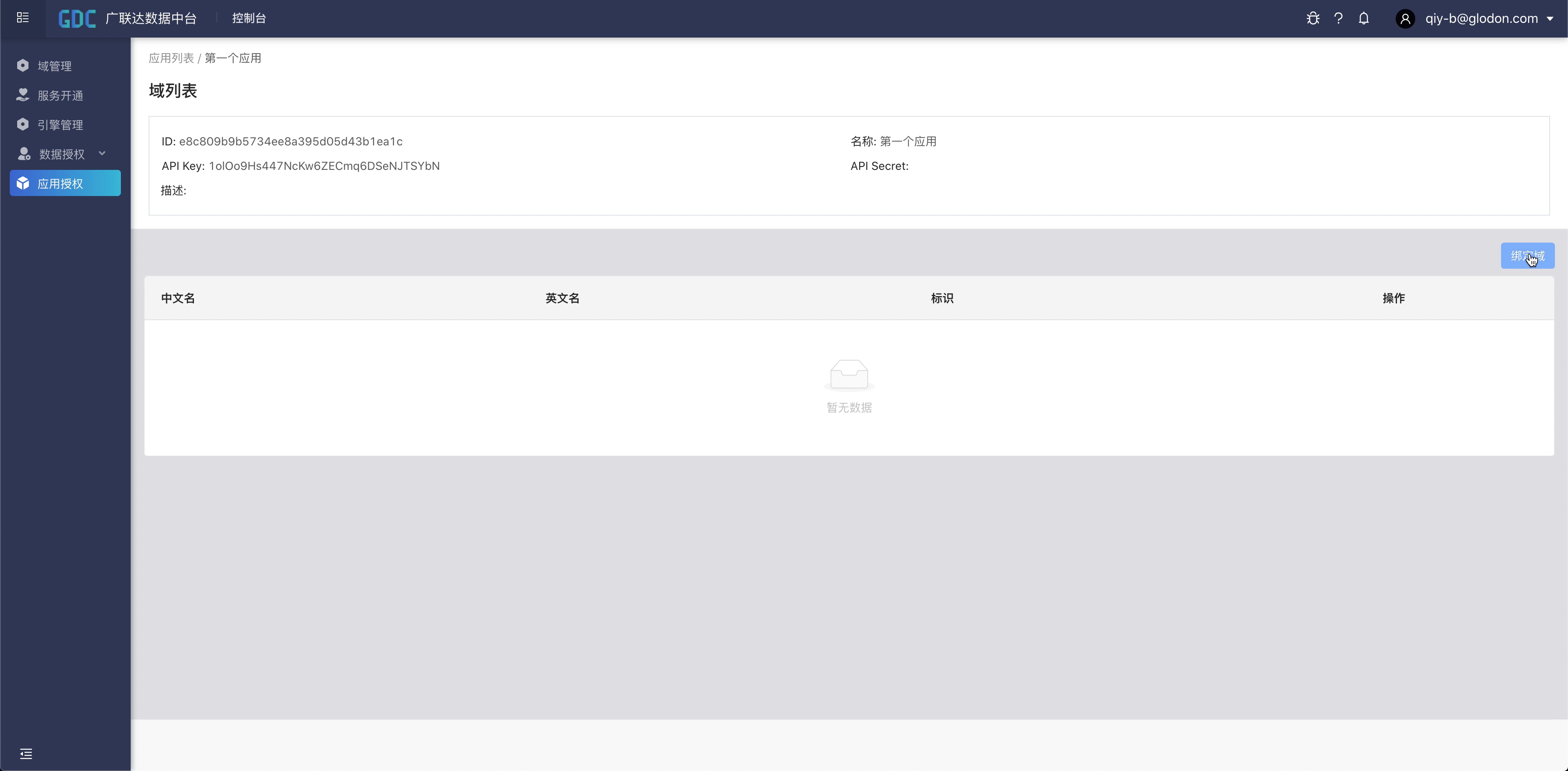 这样,我们就已经完成了应用的授权。可以通过应用的密钥信息,来访问已绑定域里面的所有资源信息了。