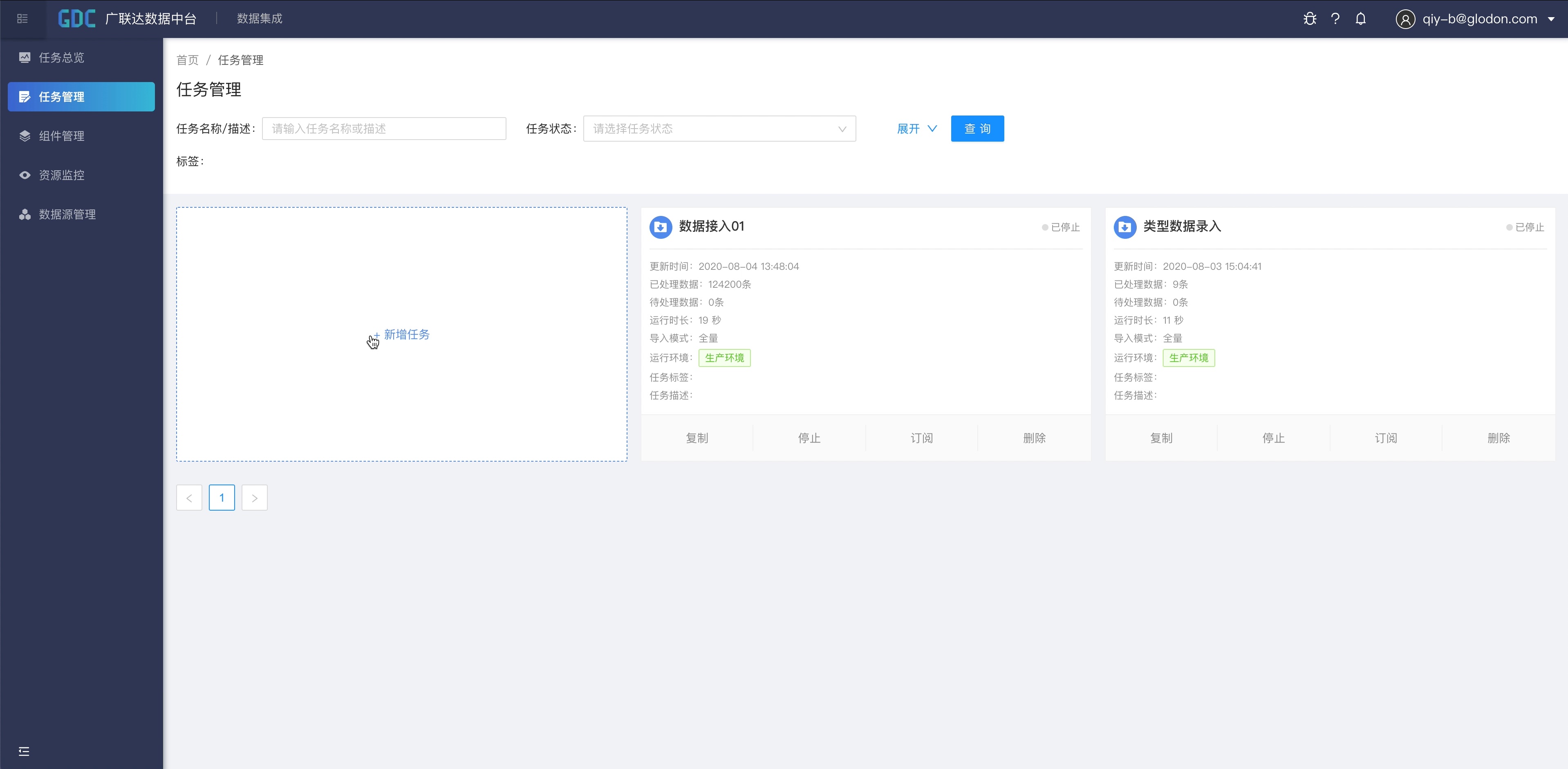 然后选择“任务管理”页面,点击“新增任务”开始创建我们的第一个集成任务。