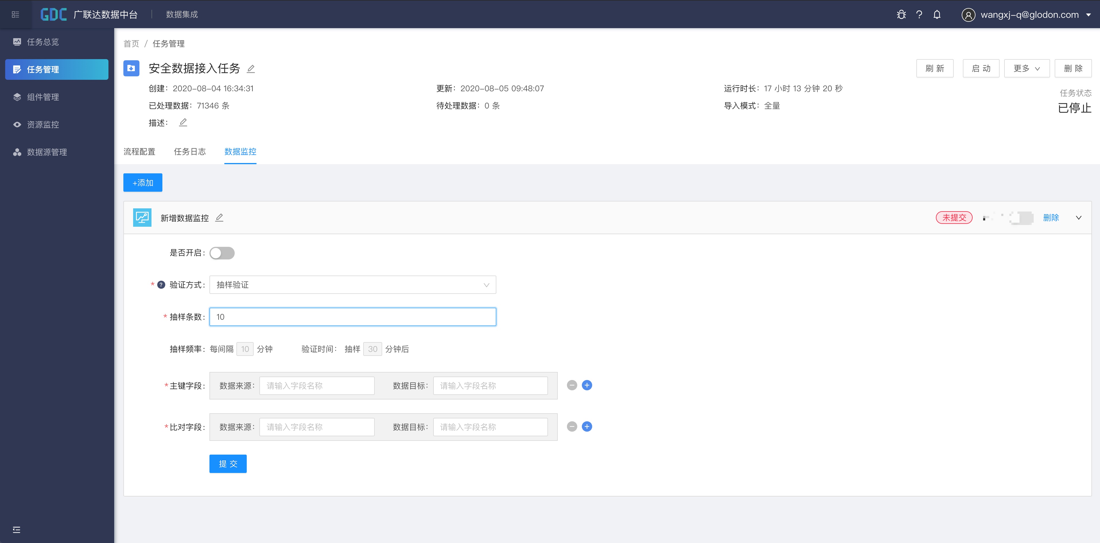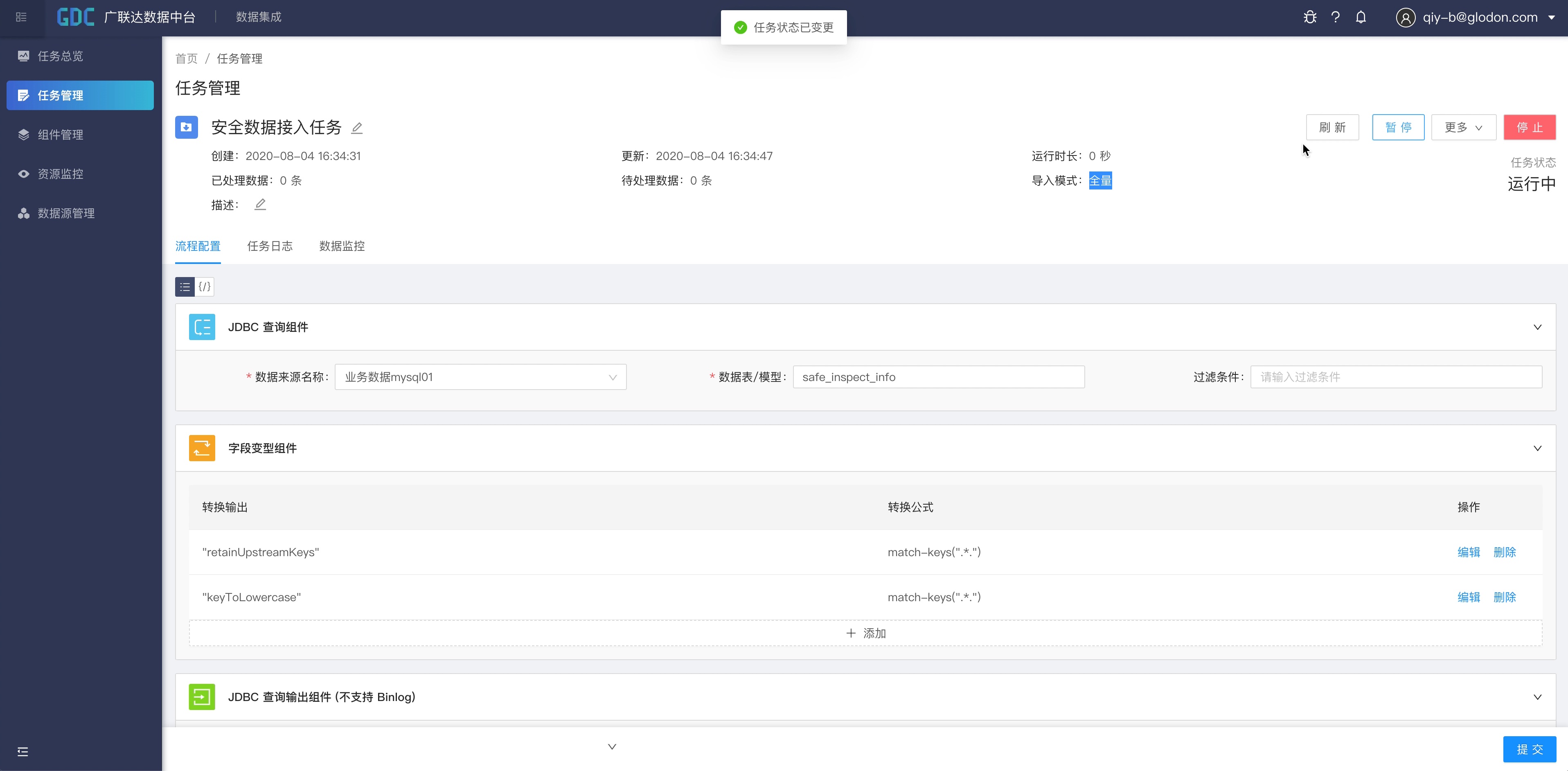点击任务上方的“启动”按钮,集成任务正式开始运行。