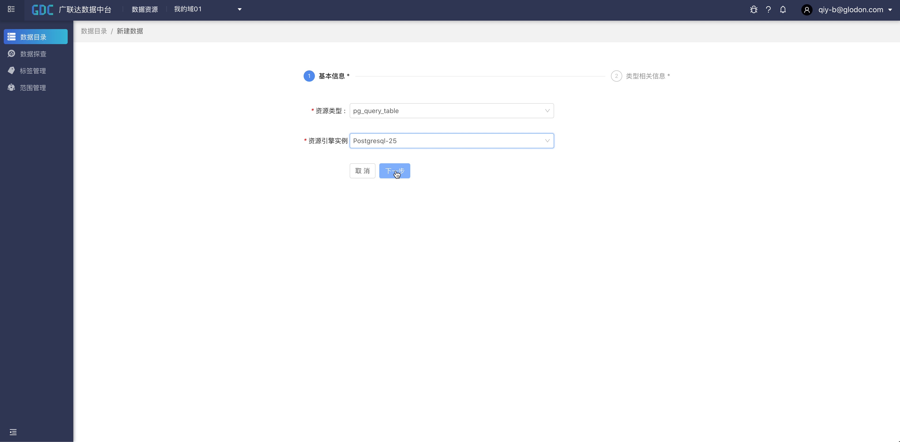 点击“创建域”按钮,输入域的编码、英文名、中文名、描述等信息,点击“下一步”
