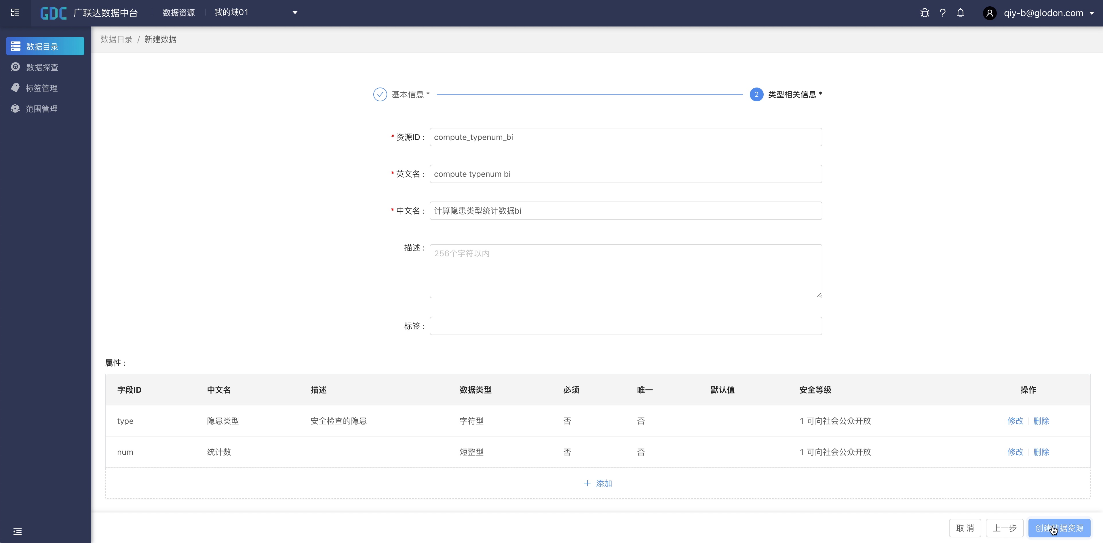 填写资源的基本信息:资源编码、英文名、中文名、描述,可选择已有的标签给这个数据资源。下面可以为这个数据资源添加更多属性信息。点击创建数据资源,就完成了数据资源的创建。