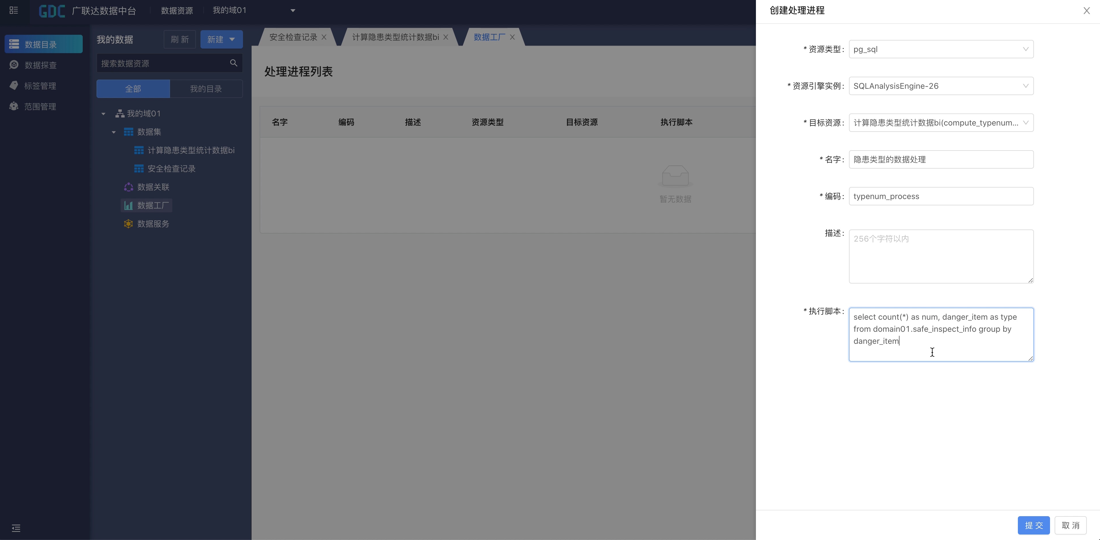 在数据工厂创建一个数据处理进程,为之前的数据计算模型提供数据加工的逻辑。这里需要选择资源类型为pg_sql(sql的加工任务)。
