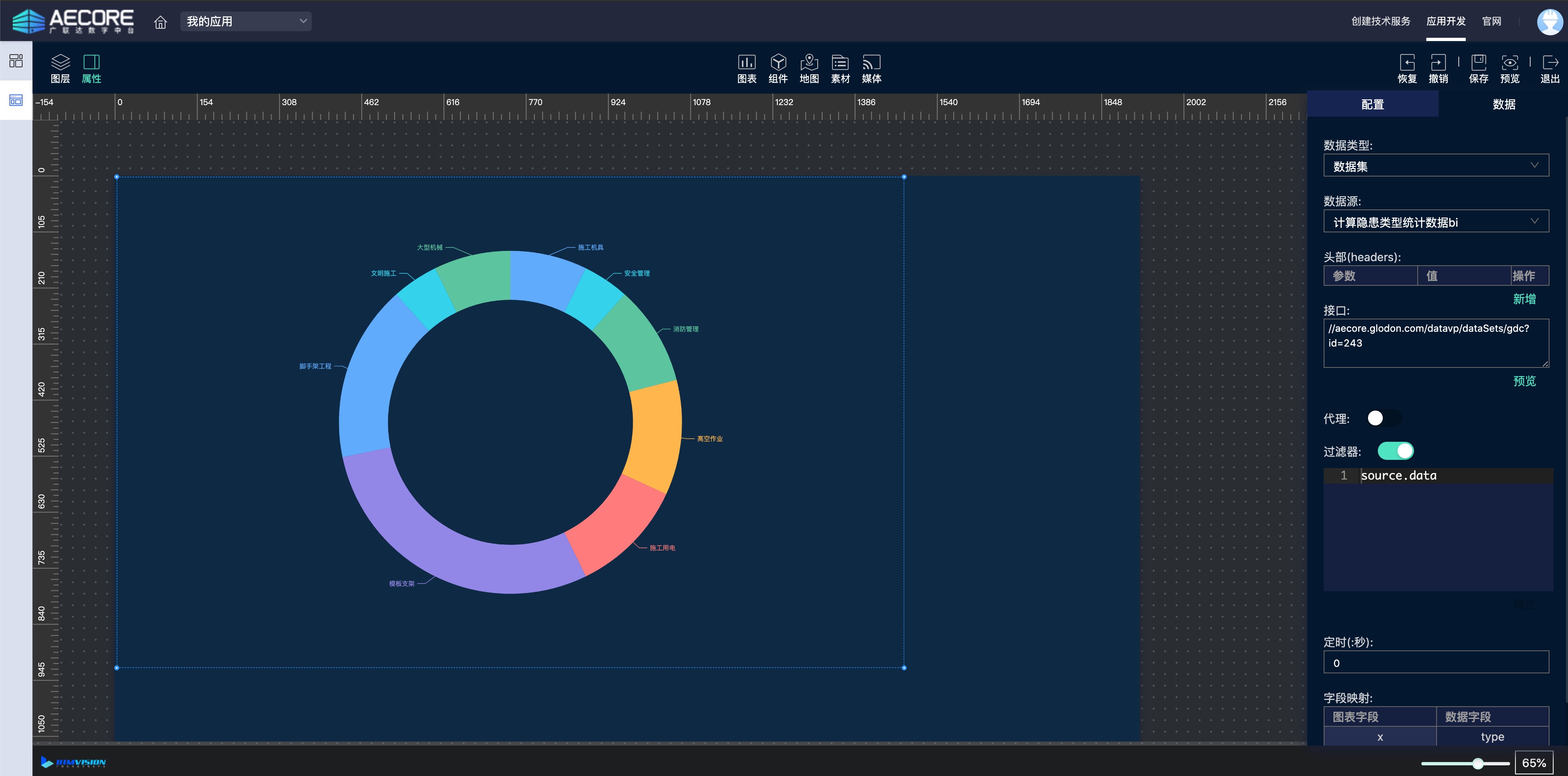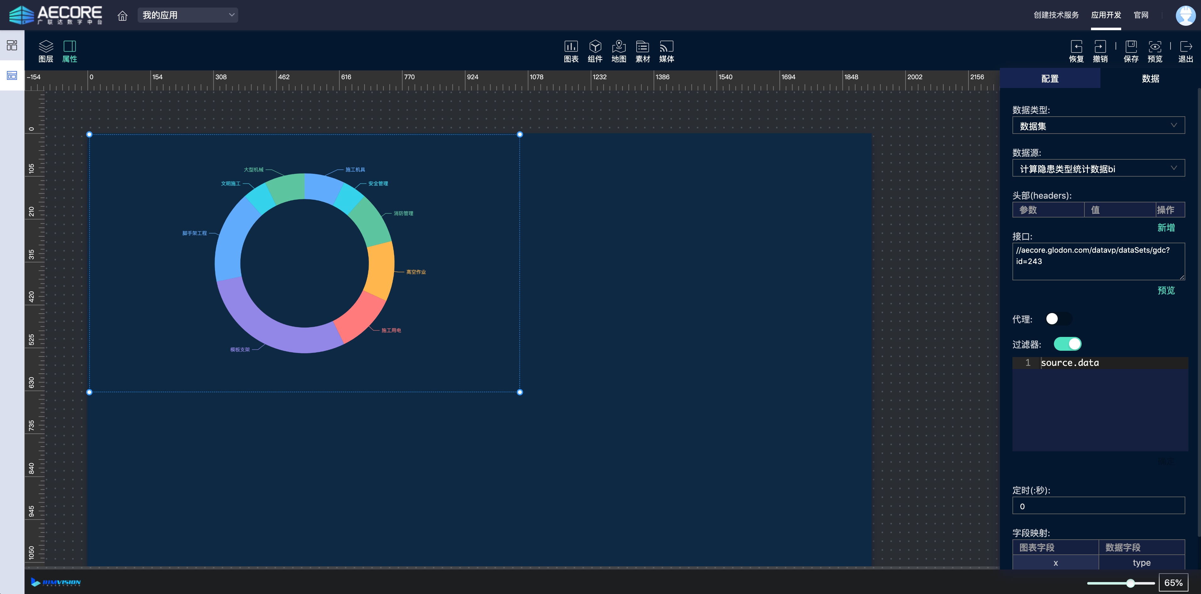 在大屏里面的图表制作中,在下拉的“数据源“选项中,选择数据中台的数据计算模型,就可以为数据可视化大屏提供实时的数据计算指标了。