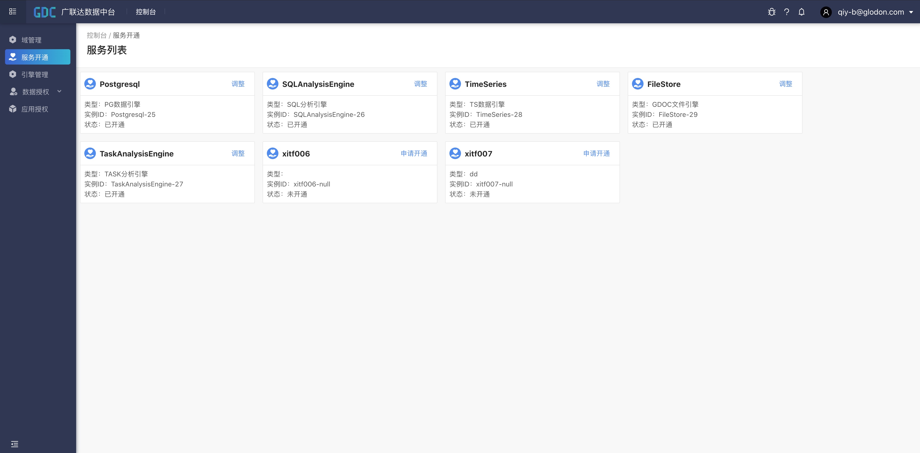 首先进入数据中台的控制台模块,选择“服务开通”菜单,将所需要的服务申请开通。