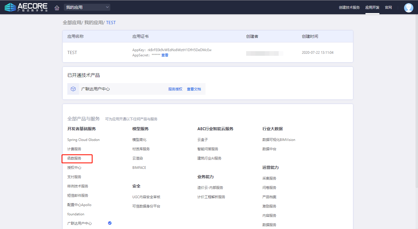 登录AECORE,并创建应用,创建应用后即可获取appkey、appsecret,这是调用服务的秘钥请妥善管理。