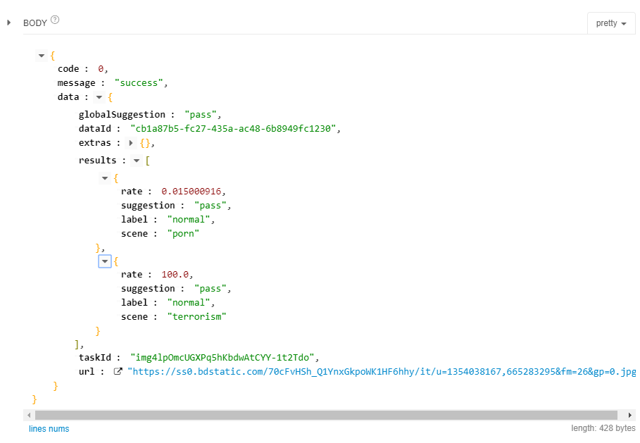 | suggestion | 字符串 | 是 | 每个scene的检测结果,可作为规则调整优化的参考,取值: pass:图片正常或者未识别出目标对象,无需进行其余操作 review:检测结果不确定或者识别出目标对象,需要进行人工审核 block:图片违规,建议直接删除或者限制公开 |